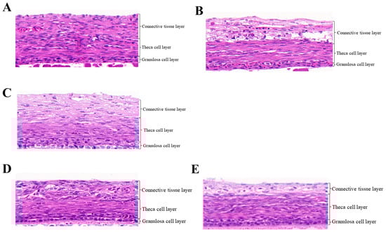 After fixation, the follicles were dehydrated and embedded in paraffin wax. Thin sections measuring 5 μm in thickness were prepared, stained with hematoxylin and eosin, and examined under a light microscope (Nikon, Tokyo, Japan). The thicknesses of the GC layer, TC layer and CT layer in the follicles were measured using ImageJ 2X software (National Institutes of Health, Bethesda, MD, USA). The arrangement of GC is relatively neat, and the nucleus presents a square shape; the cell nuclei of the TC and CT layer are long spindle, and the arrangement of CT cells is very loose [21].