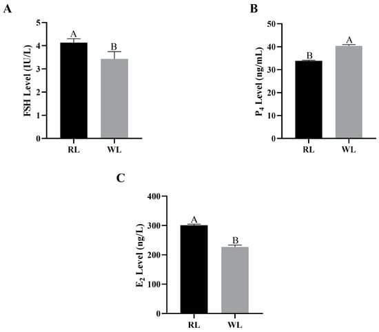 The concentration of estradiol (E2, df = 4, A), progesterone (P4, df = 4, B) and follicle-stimulating hormone (FSH, df = 4, C) in pigeon follicle yolk under red light. Values marked with different capital letters on the bars are extremely significantly different (p < 0.01).