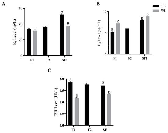 The concentration of estradiol (E2, df = 16, A), progesterone (P4, df = 16, B) and follicle-stimulating hormone (FSH, df = 9, C) in pigeon plasma under red light. Values marked with different capital letters on the bars are extremely significantly different (p < 0.01).