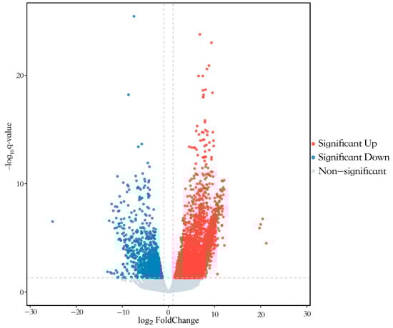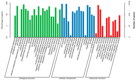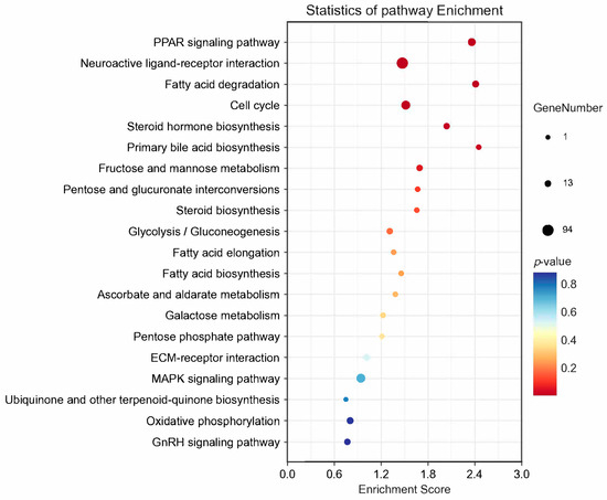 Six libraries were constructed, yielding a total of 41.66 Gb of clean bases through high-throughput sequencing (Table 3). The average GC content was 49.20%, with over 93.39% of bases achieving a Q30 quality score. Between 82.07% and 87.11% of reads were successfully mapped to the pigeon reference genome (Columba livia). DEGs were identified in ovaries between the RL and WL groups, with a Fold-Change ≥ 2 and Q-value < 0.05. A total of 4991 genes were differentially expressed, 3769 DEGs were up-regulated and 1222 DEGs were down-regulated (Figure 4). GO analysis classified the DEGs into categories such as biological regulation, cellular processes, metabolic processes, reproduction and reproductive processes for biological processes; cell, cell part, organelle and membrane for cellular components; and binding, catalytic activity, transporter activity and molecular transducer activity for molecular functions (Figure 5). The KEGG analysis of DEGs was categorized into neuroactive ligand–receptor interaction, cell cycle, PPAP signaling pathway, steroid hormone biosynthesis, oxidative phosphorylation and the GnRH signaling pathway (Figure 6). Additionally, a PPI network was constructed, suggesting that genes such as HSD11B1, VEGFD, WNT6, SMAD6 and LGR5 may play roles in follicle selection in pigeons under RL (Figure 7).