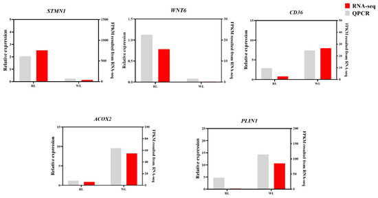 Six DEGs were randomly selected for RT-qPCR to validate the transcriptome data (Figure 8). The expression patterns of these six genes in both the RL and WL groups aligned with the RNA-seq results, further substantiating the accuracy of the transcriptome analysis.