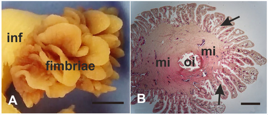 Macroscopic (A) and histological view (B) of baboon Papio hamadryas oviductal fimbriae stained with Hematoxylin-Eosin. In B, note the opening of the infundibulum (oi). oi, ostium of the infundibulum; mi, muscular of the infundibulum; arrow, mucosal folds of the fimbriae. Scale bar: (A) 2 mm; (B) 500 µm.