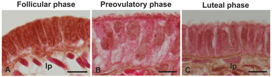 The histomorphological analysis demonstrated that the epithelium lining the mucosa of the fimbriae reached the maximum height and differentiation status during the preovulatory phase (Figure 2) (see citation number 30 for morphometric details).