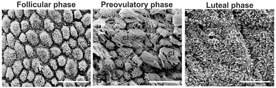 SEM analysis (Figure 3) revealed well-differentiated ciliated and nonciliated cells only during the preovulatory phase. The nonciliated cells showed short microvilli on the apical membrane.