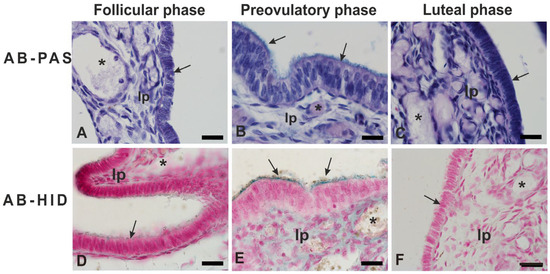Conventional histochemical staining of fimbria epithelium of baboon Papio hamadryas oviduct during the menstrual cycle. Note the absence of PAS staining (A–C) and the presence of AB 2.5 staining (azur staining) during the follicular and preovulatory phase (D,E). HID staining (brown staining) was detected only during the preovulatory phase (E). In (A–C), nuclei were stained with Hematoxylin. In (D–F), nuclei were stained with nuclear fast red. lp, lamina propria; arrow, luminal surface of the epithelium; asterisk, blood vessel. Scale bar: 20 µm.