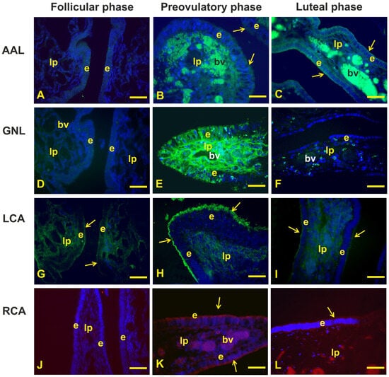 AAL, GNL, LCA, and RCA120 binding sites in the mucosal epithelium of baboon Papio hamadryas oviductal fimbriae during the menstrual cycle. (A–C), expression of aL-Fuc terminating glycans revealed with LTA. (D–F), presence of terminal α1-3mannose residue detected by GNL. (G–I), localization of complex N-linked glycans by means of LCA. (J–L), lactosamine terminating glycans identified by RCA120. Note that the investigated glycans were mainly expressed during the preovulatory phase compared to other menstrual cycle phases. bv, blood vessel; e, epithelium; lp, lamina propria; arrow, luminal surface of the epithelium. Scale bar: 40 µm. AAL, GNL, and LCA were FITC-conjugated lectins. RCA was TRITC-conjugated lectin.
