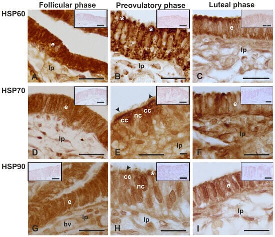 HSP70 was detected in the cytoplasm and nucleus of all cells constituting the fimbria epithelium during the follicular phase (Figure 6D) and preovulatory phase, which displayed chaperonin also in the cilia (Figure 6E). During the luteal phase, the HSP70 immunoreactive pattern (Figure 6F) was similar to that described for HSP60.