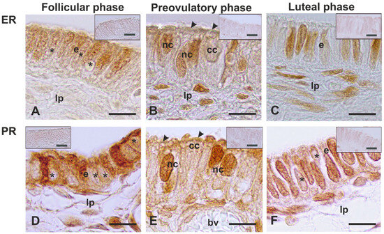 PR immunostaining was stronger than the ERα one. During the follicular phase, the PR was detected in the nucleus and cytoplasm of epithelial cells, alternating with cells displaying a weakly stained cytoplasm (Figure 7D). The preovulatory fimbria epithelium displayed strong PR-immunoreactivity in the nucleus of nonciliated cells and at the base of the ciliary stalk (Figure 7E). The luteal-phase fimbria epithelium showed the PR in the nucleus of most cells and a few cells’ cytoplasm (Figure 7F).