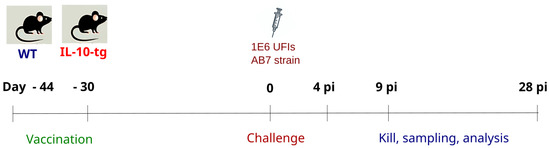 Mice were challenged with 106 inclusion-forming units (IFUs) of Chlamydia abortus in 0.2 mL of 0.1 M phosphate-buffered saline (PBS), pH 7.2 intraperitoneally and monitored daily. Non-vaccinated challenged control groups (WT-c and IL10-tg-c) consisted of 5–7 mice each and received 0.2 mL of sterile PBS. These mice were euthanized at 4, 9, and 28 days post-inoculation (dpi.) (Figure 1). During necropsy, blood samples were obtained via cardiac puncture and liver tissue samples were preserved in either 10% formalin or a Zinc fixative agent (BD Biosciences, Pharmingen, San Jose, CA, USA), then embedded in paraffin for histopathological or immunopathological evaluations. All experimental procedures were conducted in duplicate.