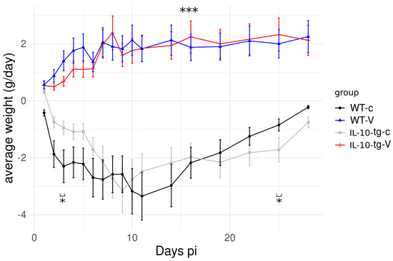 Morbidity, measured as daily weight loss, in IL-10-tg and wild-type mice (WT). Weight loss was only significant in vaccinated (V) as compared to control non-vaccinated (c) groups. Weight loss and slower recovery was observed in IL-10-tg-c mice 20 days p.i. No mortality was observed in any of the groups. (*** p < 0.001; * p < 0.05).