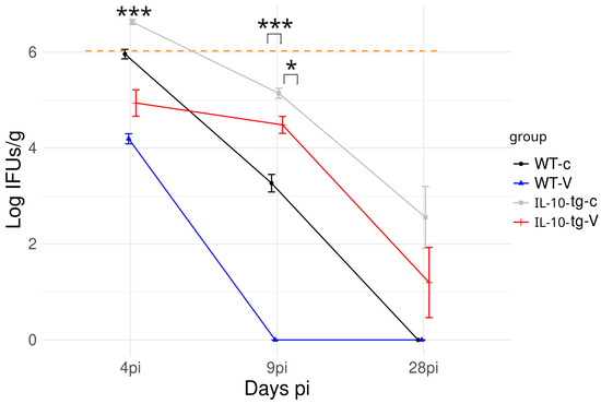 Temporal analysis of C. abortus infection levels in liver tissue after infection as measured by IFUs/g. Although a reduction in infection levels was noted in all mouse groups, only the vaccinated WT group (WT-V) was able to clear the bacteria from the liver by day 9 p.i. At 28 days p.i., C. abortus was detected only in IL-10-tg mice, which was the case for both control (tg-c) and vaccinated (tg-V) groups. The orange line marks the challenge dose at day 0 p.i. (*** p < 0.001; * p < 0.05).