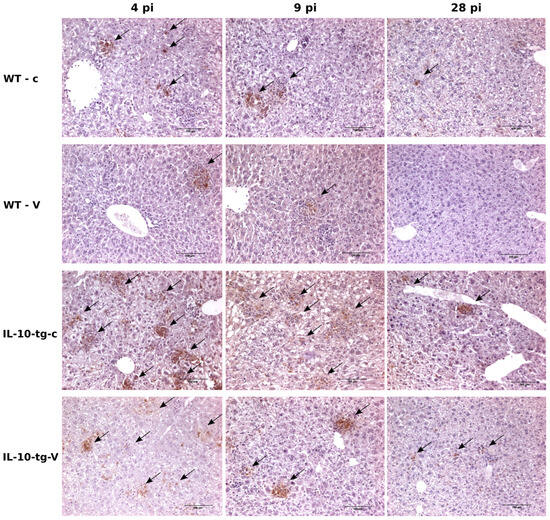 Inflammatory response and chlamydial antigen levels in WT and IL-10-tg mice at different time points after infection. At day 4 p.i., both WT and IL-10-tg mice developed multifocal hepatitis with high levels of chlamydial antigen, even after vaccination. WT vaccinated (WT-V) mice exhibited inflammation predominantly with macrophages and PMNs, while IL-10-tg (IL-10-tg-V) mice had fewer and smaller foci dominated by macrophages. By day 9 p.i., lymphocytes predominated at inflammatory sites in both strains. By day 28 p.i., the presence of small inflammatory foci with chlamydial antigen in IL-10-tg-V suggested a reduced protective effect of vaccination compared to WT-V mice. Black arrows indicate the presence of chlamydial antigen in the tissue sections.