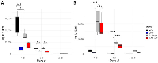 IFN-γ and IL-10 levels in sera at different time points after infection: (A) IFN-γ had significantly higher values in the non-vaccinated groups, particularly in WT mice; (B) IL-10 was significantly elevated in IL-10-tg overexpressing mice as compared to WT mice at 4 and 9 days p.i. in both the control and vaccinated groups (tg-c and tg-V). (Black dots represent individual data points beyond the interquartile range. *** p < 0.001; ** p < 0.01; * p < 0.05).