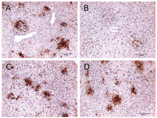 Expression of iNOS at day 4 p.i. in the liver. While iNOS expression remained unaffected in IL-10-tg mice, it was significantly reduced in the WT control group following vaccination ((A) WT non-vaccinated; (B) WT vaccinated). In contrast, the expression of iNOS was strong in the liver macrophages of IL-10-tg mice ((C) IL-10-tg non-vaccinated; (D) IL-10-tg vaccinated).