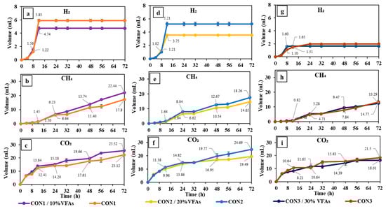 Cumulative gas production by incubation of concentrate and 10%VFA (a–c), 20%VFA (d–f), and 30%VFA (g–i) energy replacement.