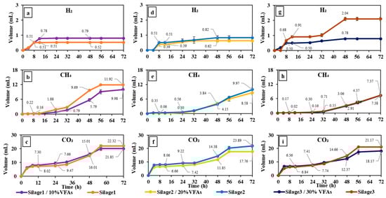 Cumulative gas production by incubation of silage and 10%VFA (a–c), 20%VFA (d–f), and 30%VFA (g–i) energy replacement.
