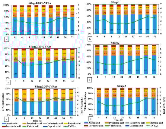 VFA production by replacing (a) 10%, (c) 20%, and (e) 30% silage energy with VFA mixture.