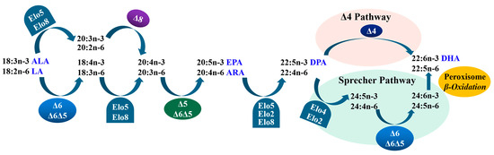 Biosynthetic pathways of LC-PUFA from precursors LA and ALA in teleosts. “∆x” denotes reactions catalyzed by fatty acyl desaturases, Fads; “Elo” indicates reactions catalyzed by elongation of very-long-chain fatty acid proteins, Elovl [5].