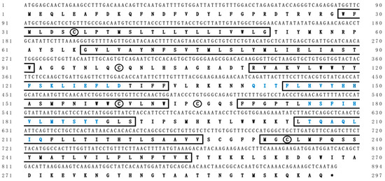 In this study, we identified the cDNA sequence by integrating genome scanning, bioinformatic analyses, and molecular experiments. The ORF of Chinese sturgeon elovl2 was 894 bp in length, which was predicted to encode a protein with 297 putative amino acid residues (Figure 2). The deduced protein was recognized as a membrane protein and it contained seven transmembrane hydrophobic α-helices and four conserved motifs of elongases (Figure 2). Meanwhile, five cysteine residues, important amino acids for maintaining the tertiary structure of proteins, were identified in this elongase protein. The cDNA sequence of Chinese sturgeon elovl2 was deposited in the GenBank database under an accession number OQ910508.