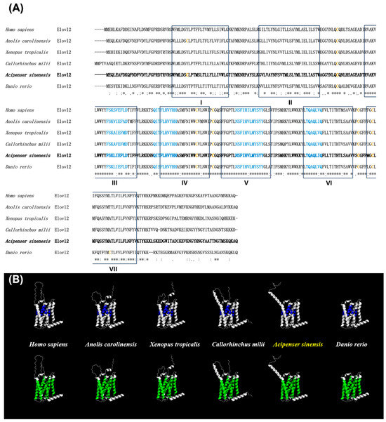 Multiple protein sequences alignment (A) and 3D structural prediction (B) of Elovl2s between Chinese sturgeon and five other vertebrates. Seven putative transmembrane domains are boxed and labeled with I to VII, respectively. Four conserved motifs of elongase are marked in blue type. Cysteines are marked in brown type. Asterisks (*) indicate the conservation of the amino acids among these sequences (A). The transmembrane regions and conserved motifs are colored in blue and green in the 3D structure, respectively (B).