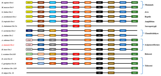 Synteny comparisons of elovl2s in vertebrates. The colored blocks represent different genes. The solid lines represent intergenic regions. The target species of the present study is marked in red type.