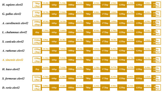 3.3. Synteny and Gene Structure Comparison of the Elvol2 in Vertebrates
