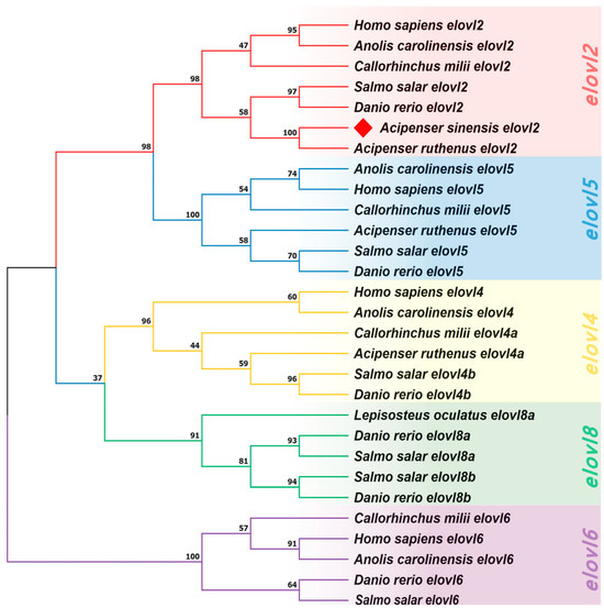 A Neighbor Joining (NJ) tree was generated to help better understanding the evolutionary relationships of Elovl2s among vertebrates (Figure 6). The results show that the phylogenetic tree was divided into five clusters including elovl2, elovl5, elovl4, elovl8, and elovl6 subfamilies (Figure 6), and the elovl2 subfamily was adjacent to the elovl5 subfamily (Figure 6). Furthermore, the Chinese sturgeon putative elovl2 was clustered in the elovl2 subfamily and shared its closest relationship with sterlet (Acipenser ruthenus) elovl2 (Figure 6). The phylogenetic tree had high node support rates.