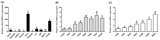 Relative mRNA spatial (A) and temporal (B,C) distribution patterns of the Chinese sturgeon’s elovl2. Ten tissues including the heart, intestine, kidney, muscle, liver, stomach, eye, gill, spleen, and brain were analyzed (A). Eight stages embryos (0.5, 5, 11, 22, 46, 54, 76, and 103 h post-fertilization) (B) and seven stages fish (1, 3, 6, 9, 12, 16, and 20 days post-hatching) were analyzed (C). Data are means ± SEM (n = 6). Different lowercase letters above the bars denotes significant differences among the treatments (p < 0.05).