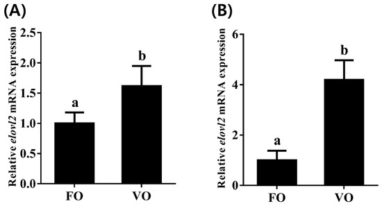 The expressions of elovl2 mRNA in different tissues ((A), liver; (B), brain) of Chinese sturgeon fed diets containing fish oil (FO) or vegetable oil (VO). Data are means ± SEM (n = 6). Different lowercase letters above the bars denote significant differences between diets (p < 0.05).