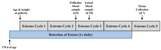 Experimental design. The once daily detection of estrus began at approximately 170 d of age. Puberty was considered the first display of behavioral estrus. The detection of estrus continued for a total of five consecutive estrous cycles. At the onset of the third estrous cycle (d 0), blood was collected via jugular venipuncture (follicular sample) and 10 d later (luteal sample). Animals were euthanized and reproductive tissues were collected on approximately day 7 of the fifth estrous cycle.