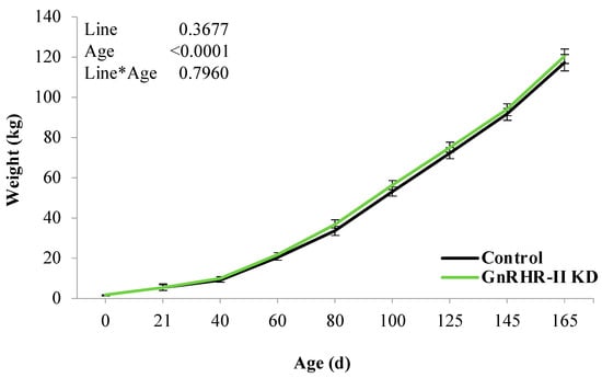 Body weights were not different between GnRHR-II KD (n = 8) and littermate control (n = 7) gilts over time. Body weight was recorded at birth, weaning, and during pre-pubertal development (40, 60, 80, 100, 125, 145 and 165 d of age). Results are presented as least squares means (LSMEANS) ± the standard error of the mean (SEM). Line, p = 0.3677; Age, p < 0.0001; Line × Age, p = 0.7960.