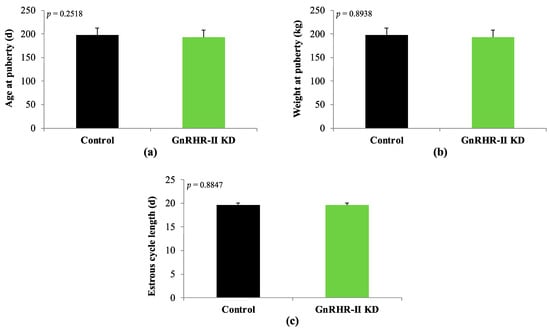 Age at puberty (a), weight at puberty (b), and estrous cycle length (c) in GnRHR-II KD (n = 8) and littermate control (n = 7) gilts. No line effects were detected (p > 0.10). Results are presented as least squares means (LSMEANS) ± the standard error of the mean (SEM).