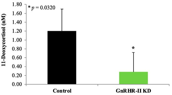 Line by phase interactions were not detected for any corticosteroids (p > 0.10). An effect of phase (p < 0.05) was detected for the following corticosteroids: 11-deoxycortisol, corticosterone, cortisol, and cortisone (Table 1). Serum concentrations for these hormones were greater during the follicular compared with luteal phase (p < 0.05; Table 1). An effect of line was detected for 11-deoxycortisol (p = 0.0320), with a lower circulating concentration present in GnRHR-II KD compared to littermate control gilts (Figure 4). Aldosterone concentration was not affected by line, phase, or line by phase interaction (p > 0.10). Etiocholanolone was not detectable in any gilt serum samples.