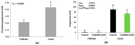 No effect of line or line by phase interaction was observed for 17α-hydroxyprogesterone (p > 0.10). An effect of phase was detected for 17α-hydroxyprogesterone (p = 0.0006; Figure 5a). As expected, luteal samples (0.43 ± 0.04 nM) contained 2-fold more 17α-hydroxyprogesterone compared to follicular samples (0.21 ± 0.04 nM; Figure 5a; p = 0.0006). A line by phase interaction was detected for progesterone (p = 0.0341; Figure 5b), indicating that GnRHR-II knockdown affected progesterone concentration during only one sampling period (luteal phase). Serum progesterone concentration was not different between genotypes during the follicular phase (p > 0.10; Figure 5). However, serum progesterone concentration increased significantly in both lines during the luteal phase, as expected (p < 0.05; Figure 5b). Interestingly, however, GnRHR-II KD gilts had 18% less progesterone in circulation during the luteal phase (74.7 ± 6.5 nM) compared with littermate control females (90.6 ± 7.0 nM; p < 0.05; Figure 5b).