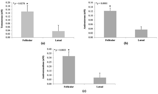 Line by phase interactions were not observed (p > 0.10) for any androgens examined. There was also no effect of line on serum androgen concentrations (p > 0.05). However, phase effects were detected for testosterone, androsterone, and androstenedione (p < 0.05; Figure 6). Concentrations of these steroids were greater during the follicular versus luteal phase in gilts. Serum testosterone concentration was 4-fold greater in follicular (0.15 ± 0.03 nM) compared with luteal (0.04 ± 0.03 nM) samples (p = 0.0278; Figure 6). Androsterone was 3-fold greater in follicular (0.12 ± 0.01 nM) versus luteal (0.04 ± 0.01 nM) serum samples (p < 0.0001; Figure 6). The concentration of androstenedione was 5-fold greater in follicular (0.32 ± 0.05 nM) compared to luteal (0.07 ± 0.05 nM) samples (p = 0.0023; Figure 6). The following androgens were either completely or largely undetectable in all gilt serum samples: etiocholanolone, DHEA, DHEA sulfate, and dihydrotestosterone.