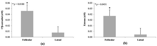 A line by phase interaction was not detected (p > 0.10) for the two estrogens (estrone and 17β-estradiol) examined. Likewise, there was no effect of line on serum estrogen concentrations (p > 0.10). As expected, there was an effect of phase on serum estrogen concentrations, with estrogen levels elevated during the follicular phase (p < 0.05; Figure 7). The concentration of 17β-estradiol was increased 10-fold in samples collected during the follicular (0.05 ± 0.01 nM) versus luteal (0.008 ± 0.01 nM) phase (p = 0.0180; Figure 7). Likewise, estrone concentration was increased by 10-fold in follicular (0.02 ± 0.005 nM) versus luteal (0.002 ± 0.005 nM) serum samples (p = 0.0451; Figure 7).