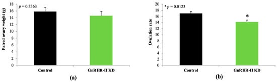 Ovarian characteristics in GnRHR-II KD (n = 8) and littermate control (n = 7) gilts. Paired ovary weight (a) was similar (p > 0.10) between lines, but ovulation rate (number of Corpora lutea) (b) was reduced (p = 0.0123) in GnRHR-II KD gilts compared with littermate controls. Results are presented as least squares means (LSMEANS) ± the standard error of the mean (SEM). * p < 0.05.