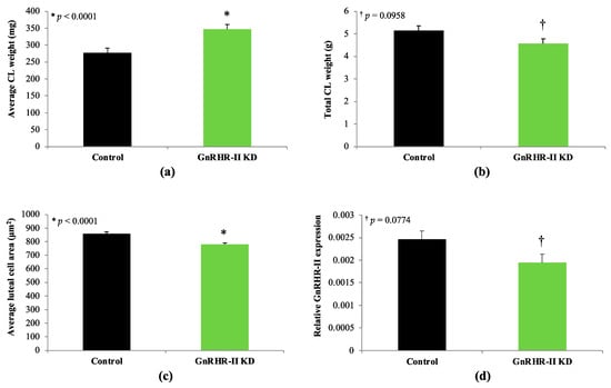 Corpus luteum (CL) metrics and GnRHR-II expression in CL samples from GnRHR-II KD and littermate control gilts. Average individual CL weight was greater (p < 0.0001) in GnRHR-II KD (n = 4) versus control (n = 4) gilts (a). Total CL weight per ovary tended to be reduced (p = 0.0958) in GnRHR-II KD (n = 4) versus control (n = 4) gilts (b). Luteal cell area was reduced (p < 0.0001) in GnRHR-II KD (n = 7) versus littermate control (n = 6) gilts (c). Expression of GnRHR-II tended to be reduced (p = 0.0774) by 21% in CL from GnRHR-II KD (n = 8) versus control (n = 7) gilts (d). Results are presented as least squares means (LSMEANS) ± the standard error of the mean (SEM). * p < 0.05; † p < 0.10.