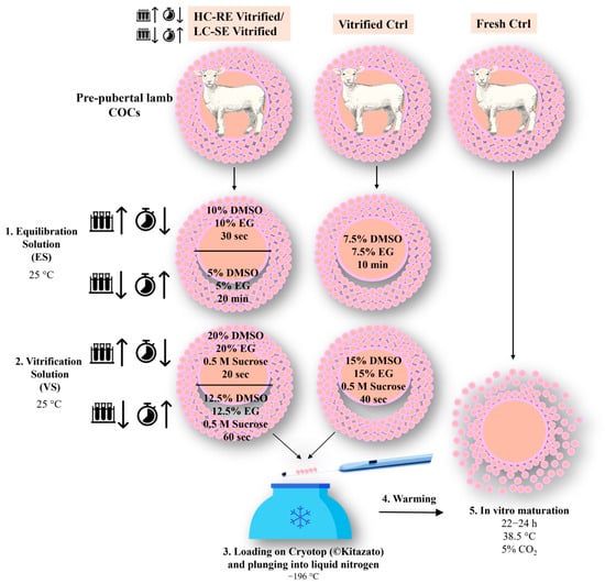 For each experiment, pre-pubertal lamb immature COCs were randomly assigned to three different groups: (1) HC-RE or LC-SE vitrification protocol, (2) traditional vitrification protocol and (3) fresh control group not undergoing vitrification. Figure 1 shows a schematic representation of the experimental design described in the present study.