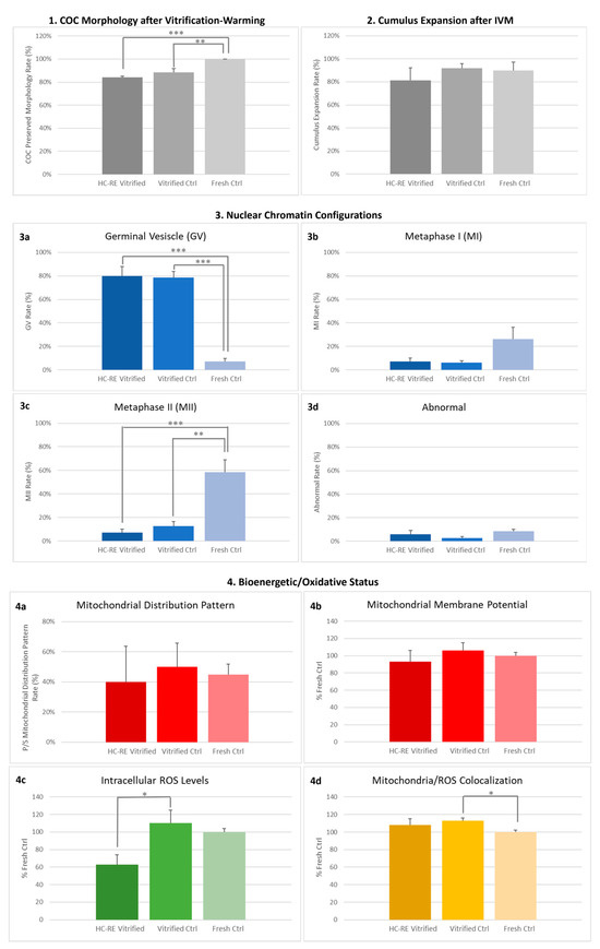 The rate of mature oocytes, obtained after COC vitrification through both HC-RE and ctrl protocol and subsequent IVM, were significantly lower in comparison to fresh ones (p < 0.001 and p < 0.01, respectively; Figure 2 panel 3), without differences between the two vitrification groups. In both cases, corresponding higher rates of GV-stage oocytes were observed (p < 0.001 and p < 0.01, respectively; Figure 2 panel 3), demonstrating that both vitrification protocols induced severe modifications in the oocyte, thus strongly affecting the ability to resume meiosis and reach maturation.