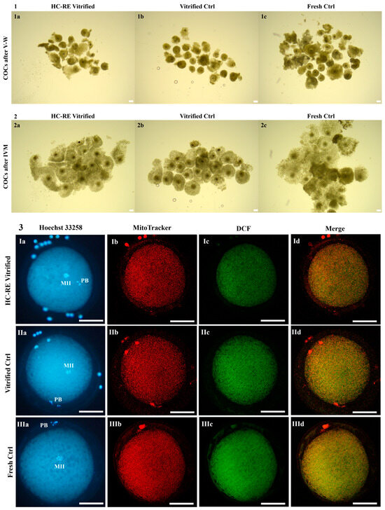 Effects of HC-RE vitrification protocol in pre-pubertal lamb COCs: (1) pre-pubertal lamb COCs in HC-RE vitrified, vitrified ctrl and fresh ctrl, as observed before IVM. Scale bars represent 120 µm. (2) Pre-pubertal lamb COCs in HC-RE vitrified, vitrified ctrl and fresh ctrl, as observed after IVM. Scale bars represent 120 µm. (3) Photomicrographs showing representative images of one MII oocyte obtained in HC-RE vitrified, vitrified ctrl and fresh ctrl after IVM. Corresponding epifluorescence images showing (Ia–IIIa) nuclear chromatin configuration (Hoechst 33258) and confocal images showing (Ib–IIIb) mitochondrial distribution pattern and activity (MitoTracker Orange), (Ic–IIIc) intracellular ROS localization and levels (DCF) and (Id–IIId) mitochondria/ROS colocalization (Merge). Confocal images were taken at the oocyte equatorial plane. Scale bars represent 40 µm.