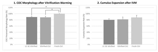 The application of LC-SE vitrification protocol highlighted comparable rates of COCs showing preserved morphology at warming with the vitrification control group (Figure 4 panel 1 and Figure 5 panel 1). This parameter was significantly reduced by both vitrification protocols compared to fresh COCs (p < 0.05; Figure 4 panel 1 and Figure 5 panel 1) even if absolute values after both vitrification procedures were still high.
