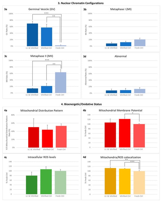 After COC vitrification, through both LC-SE and ctrl protocol and subsequent IVM, the rates of mature oocytes were significantly lower in comparison to fresh ones (p < 0.001 and p < 0.01, respectively; Figure 4 panel 3), with no differences between the two vitrification groups. In both cases, corresponding higher rates of GV-stage oocytes were observed (p < 0.001 and p < 0.01, respectively; Figure 4 panel 3), demonstrating that, also in this case, both protocols affected the ability of vitrified oocytes to resume meiosis and reach maturation.