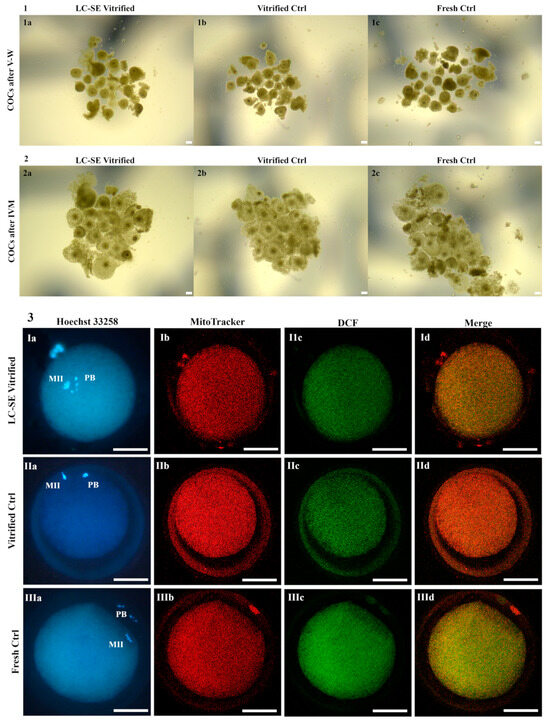 Effects of LC-SE vitrification protocol in pre-pubertal lamb COCs: (1) pre-pubertal lamb COCs in LC-SE vitrified, vitrified ctrl and fresh ctrl, as observed before IVM. Scale bars represent 120 µm. (2) Pre-pubertal lamb COCs in LC-SE vitrified, vitrified ctrl and fresh ctrl, as observed after IVM. Scale bars represent 120 µm. (3) Photomicrographs showing representative images of one MII oocyte obtained in LC-SE vitrified, vitrified ctrl and fresh ctrl after IVM. Corresponding epifluorescence images showing (Ia–IIIa) nuclear chromatin configuration (Hoechst 33258) and confocal images showing (Ib–IIIb) mitochondrial distribution pattern and activity (MitoTracker Orange), (Ic–IIIc) intracellular ROS localization and levels (DCF) and (Id–IIId) mitochondria/ROS colocalization (Merge). Confocal images were taken at the oocyte equatorial plane. Scale bars represent 40 µm.