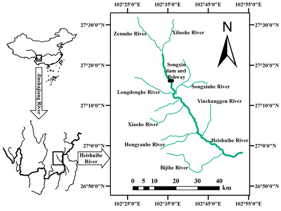 The Heshuihe River, a primary left-bank tributary of the Jinsha River, is situated within the Sichuan province of southwest China. This river is a priority conservation area for fish habitats within the Baihetan Hydropower Station reservoir. The mainstream of the Blackwater River currently has three hydroelectric stations. This study was conducted at the Songxin Power Station (Figure 1). To facilitate fish migration upstream and downstream of the dam and to restore river connectivity, this power station has built a vertical-slot fishway and a supplementary water diversion channel. The fishway is present on the left bank of the dam and can accommodate a flow rate of 0.176 m3/s with a flow velocity of 0.75 m/s. The upstream designed water level is 1067.16 m, while the downstream level is 1063.87 m. The fishway has a slope of 1.80%. The dimensions of the fishway pool are 2 m in length by 1.6 m in width. To enhance the fish attraction efficiency at the fishway entrance, an engineering solution involving the supplementary water diversion channel is implemented, thereby expanding the attraction flow range at the entrance.