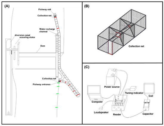 Schematic diagram of vertical slot fishway and monitoring devices in the Heishuihe River. (A) Layout of monitoring devices. The green box represents the location of fish release in the river, and the red box represents the arrangement of RFID devices. (B) Collection net device schematic. The device has a series of narrowing net openings and a constricted cross-section to collect fish. (C) Radio frequency identification (RFID) device schematic.