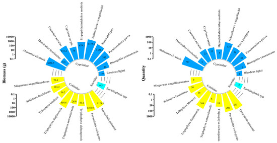 In total, 19 fish species were surveyed downstream of the Songxin Dam, including 10 from the Cyprinidae family, 8 from the Cobitidae family, and 1 from the Balitoridae family (Figure 3). The total biomass of Cyprinidae fish was 9986.0 g, Cobitidae fish accounted for 3715.4 g, and Balitoridae had only 6.3 g of biomass. In total, 1109, 806, and only 2 individuals of Cyprinidae, Cobitidae, and Euchiloglanis spp., respectively, were identified. S. wangchiachii accounted for 25.35% of the total biomass and 6.83% of the total quantity. Overall, the Cyprinidae fish species exhibited higher biomass and quantity than those of Cobitidae and Balitoridae fish, indicating that the downstream river environment below the dam is more suitable for Cyprinidae fish species.