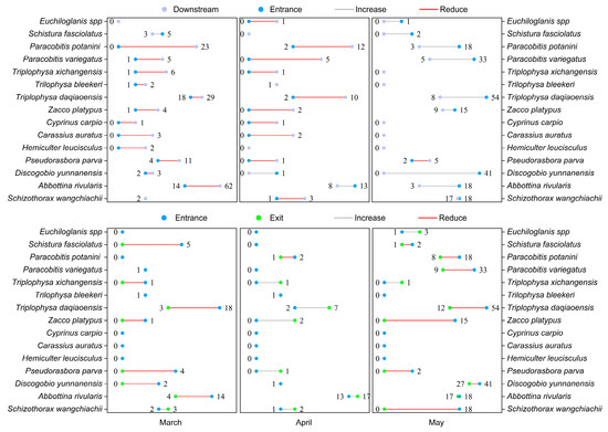 The spatiotemporal patterns of fish passage from the area near the dam to the fishway entrance and exit revealed differences in the attraction and passage efficiencies from March to May (Figure 4). From March to April, most fish were only attracted to the area near the dam, with very few finding their way to the fishway entrance, indicating that the attraction efficiency was low. In May, the number of fish at the fishway entrance significantly increased. This indicated that during this time, fish reached the area near the dam and located the fishway entrance for upstream migration. Regarding the passage efficiency within the fishway, the number and variety of fish passing through the fishway exit were higher in May than in March and April. In summary, the effectiveness of fish passage over the dam was higher in May than in March and April. Of note, 19 fish species were noted in the downstream river, and only 15 species could reach the area near the dam. Of the 15 species, only 12 could successfully reach the fishway entrance and exit. The number and variety of fish decreased throughout the upstream passage. This indicates that all fish species could not reach the fishway entrance and successfully pass over the dam.