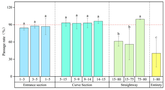 Passage rate in fishway pools. Blue represents the entrance section, green represents the curve section, cyan represents the straightway, and yellow represents the entirety. Different letters associated with the bars indicate significant differences (p < 0.05).