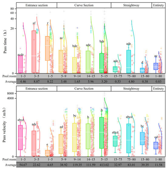 Passage time and velocity in fishway pools. The fishway was divided into several sections: the entrance section (1–5), the turning section (5–15), and the straight section (15–80). Intensified monitoring was conducted in different sections of the fishway to diagnose issues in specific pools. The figure presents the fish passage time (top) and speed (bottom) in different pool sections of the fishway, summarized and displayed as average values. Different letters associated with the bars indicate significant differences (p < 0.05).